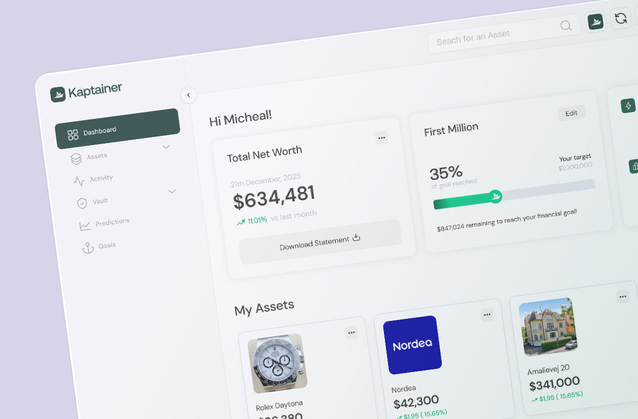 Kaptainer samler dine Assets, viser din net worth over tid og gør det nemt at dokumentere til bank og forsikring.